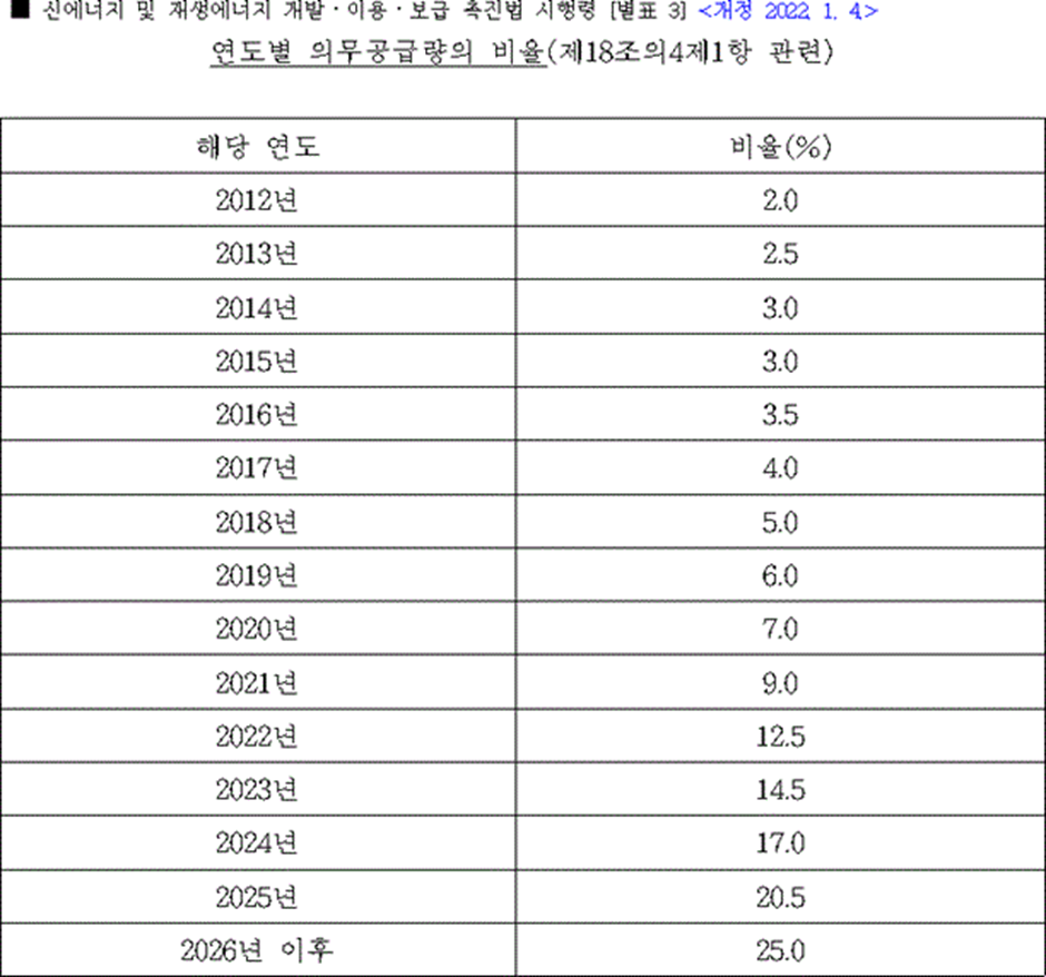 24개 발전사업자는 공급의무자로서 신에너지 및 재생에너지 개발ㆍ이용ㆍ보급 촉진법에 따라 다음과 같이 연도별 신재생에너지 의무 공급량을 반드시 확보해야 합니다. 2022년 기준 12.5%입니다.