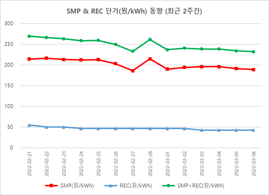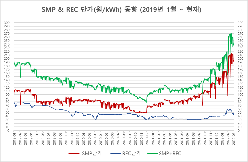 보시다시피 REC는 꾸준히 하락하고 있는데 SMP는 하락하다가 2020년 12월부터 급격히 상승 중입니다. 그러다가 지난주부터 SMP도 하락 추세를 보이고 있습니다.