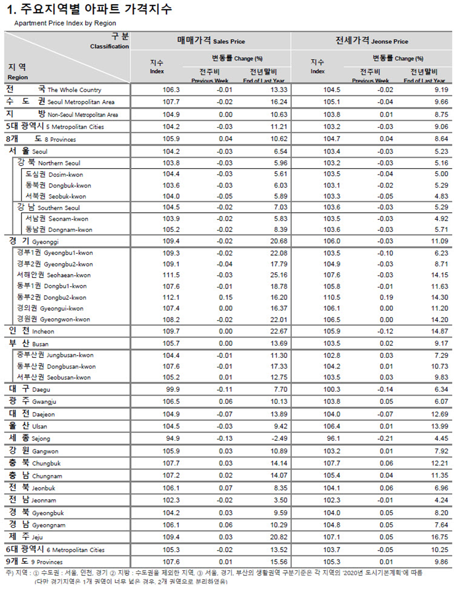 표에서 보시다시피 매매가격은 대구와 세종시를 제외하고 가격지수가 100 이상이고 전세값은 세종시만 제외하고 모두 100을 넘고 있습니다. 지난주와 비교해서 소폭 오른 곳도 있고 소폭 하락한 곳도 혼재되어 있습니다. 작년 12월에 비해서 세종시를 제외한 모든 지역이 상승했습니다. 세종시의 집값이 심상치 않은 것으로 보입니다. 다음주에 뵙겠습니다.