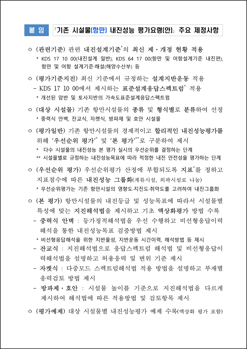 - 방파제·호안 : 시설물 높이를 기준으로 지진해석법을 다르게 제시하여 해석법에 따른 적용방법 및 검토항목 제시