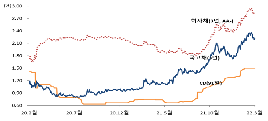 | 회사채(3년,AA-) | 2.21 | 2.42 | 2.85 | 2.85 | -0.2% | 17.8% |