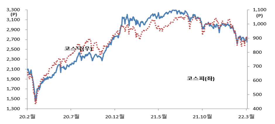 | 코스닥지수 | 968.4 | 1,034.0 | 873.0 | 901.0 | 3.2% | -12.9% |