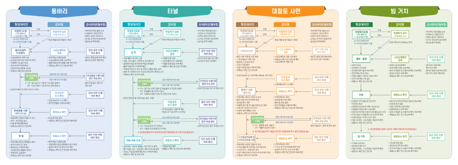 ㅇ 이의 일환으로 ‘6대 高위험 공종 현장 및 시설물’을 선정하였으며, 건설안전국장을 팀장, 사업부서 과장을 팀원으로 하는 TF팀을 구성하여 ‘20.12.29일에 1차 회의를 시작으로 현장과 부합하는 매뉴얼 작성을 위해 현장대리인 및 기술사 이상의 전문자격을 보유한 외부전문가 등의 자문 절차를 포함한 총 7차례에 걸친 회의를 통해 매뉴얼을 마련하였다.