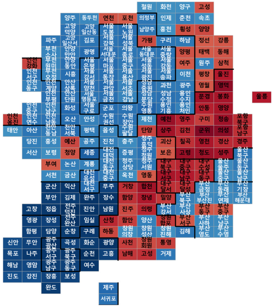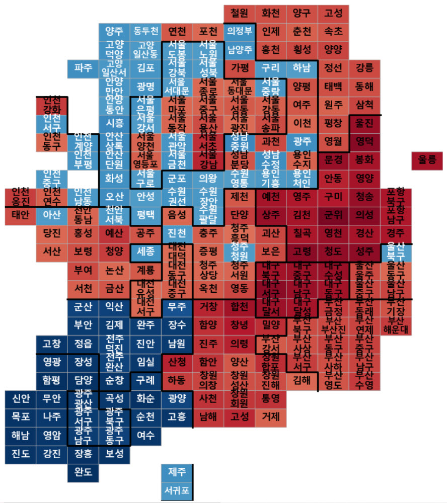 크기가 작아서 불만이신 분들을 위해 크게 키워 아래에 다시 공유 드립니다. 참고로 파란색이 진할 수록, 빨간색이 진할 수록, 차이가 크다는 의미이고, 색깔이 연할 수록 차이가 적다는 의미입니다. 색깔 변화를 좀 더 다양하게 줄 수 있지만 저는 이 데이터로 민주당과 국민의힘의 득표 차이를 극명하게 보여주고 싶었기 때문에 이렇게 표현해본 것 뿐입니다. 아무튼 5년 동안 참 많은 일들이 있었던 모양입니다. 민심이 이렇게나 변하다니요. 탄핵과 촛불 시위는 이미 다 잊은 것 같네요.