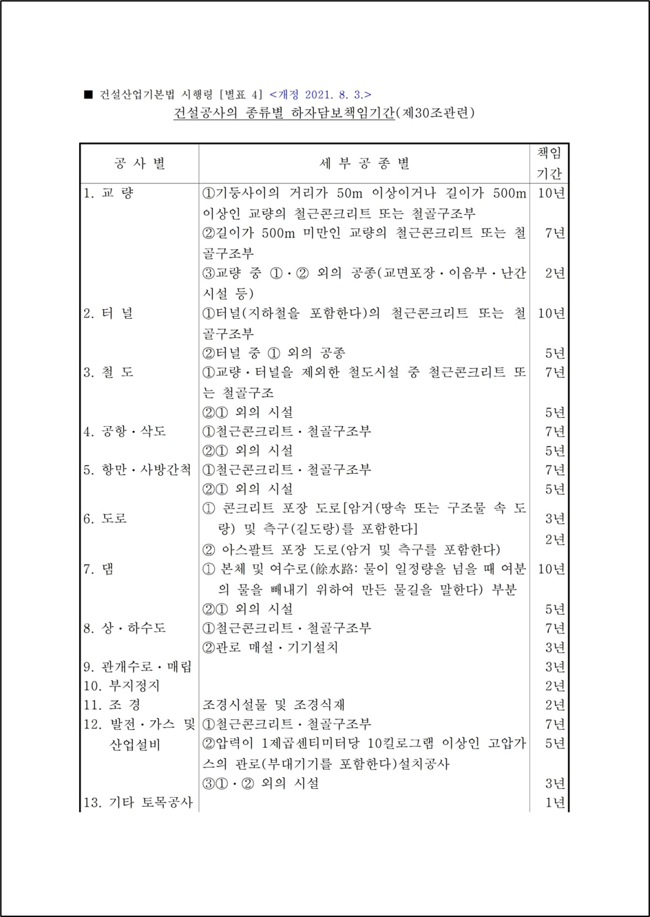 제목 : 건설산업기본법 시행령 별표4 건설공사의 종류별 하자담보책임기간