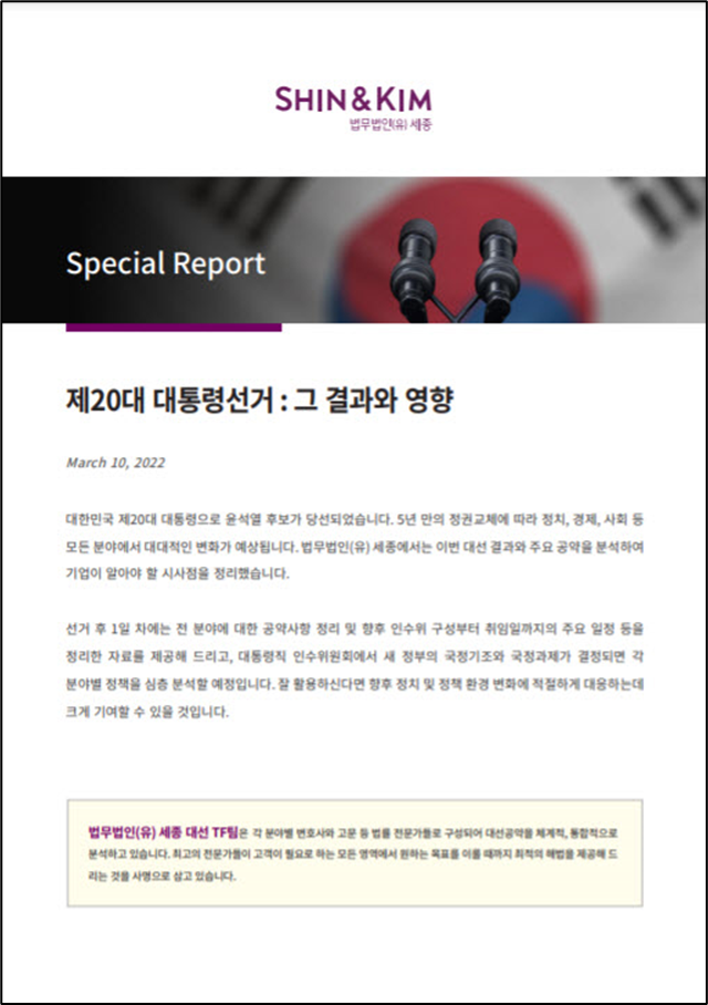 대한민국 제20대 대통령으로 윤석열 후보가 당선되었습니다. 5년 만의 정권교체에 따라 정치, 경제, 사회 등 모든 분야에서 대대적인 변화가 예상됩니다. 법무법인(유) 세종에서는 이번 대선 결