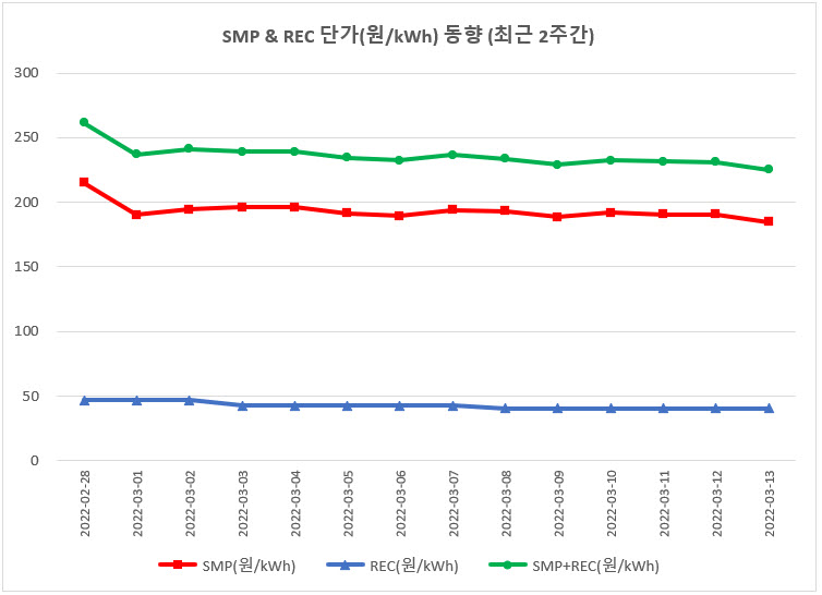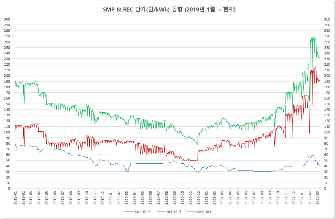 보시다시피 REC는 꾸준히 하락하고 있는데 SMP는 하락하다가 2020년 12월부터 급격히 상승했지만 최근 다시 하락 중입니다. 3월부터 SMP도 하락 추세를 보이고 있습니다.