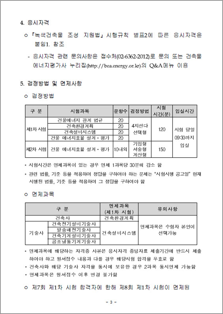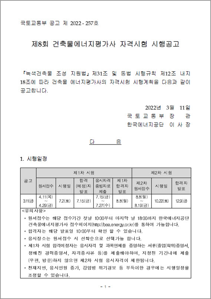 국토교통부에서 주관하는 제8회 건축물에너지평가사 자격시험 시행공고가 지난 3월 11일에 발표됐습니다. 저도 관심있게 지켜보고 있는 자격시험이며 매년 시험이 한 번 밖에 없어서 관망하고 있습니다. 나이도 있어서 도전하려면 빨리 도전해야 하는데 어떻게 해야 되나 걱정만 하고 있습니다. 올해 좀 더 진지하게 고민해보고 결정할 예정입니다.