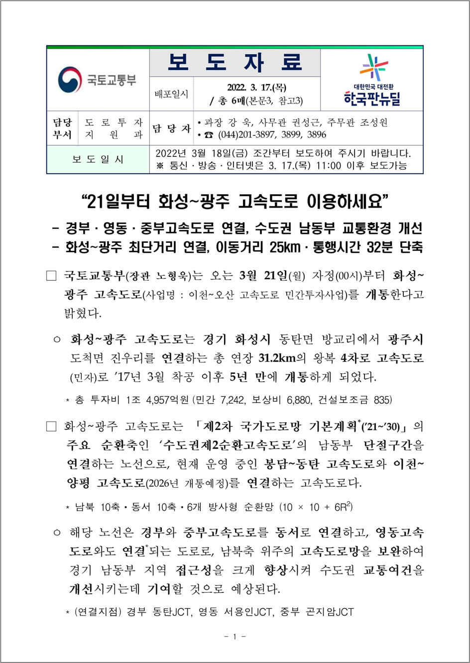 국토교통부(장관 노형욱)는 오는 3월 21일(월) 자정(00시)부터 화성~광주 고속도로(사업명 : 이천~오산 고속도로 민간투자사업)를 개통한다고 밝혔다. 화성~광주 고속도로는 경기