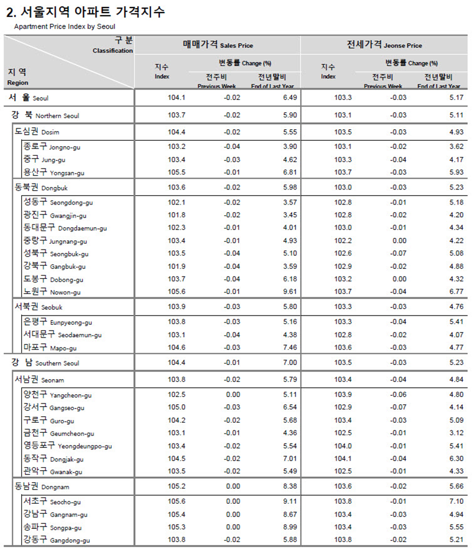 서 울 : 매매 0.02% 하락, 전세 0.03% 하락