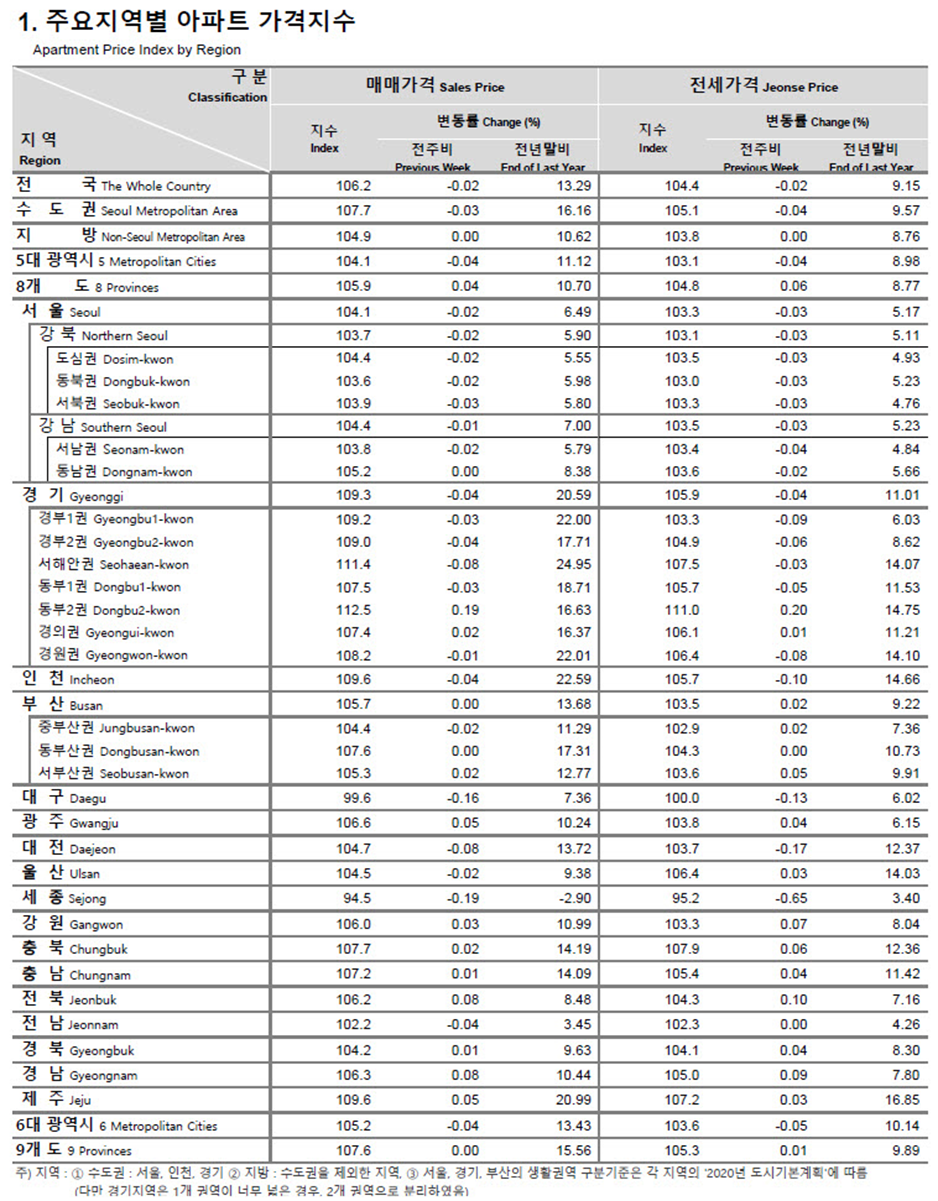 표에서 보시다시피 매매가격은 대구와 세종시를 제외하고 가격지수가 100 이상이고 전세값은 세종시만 제외하고 모두 100을 넘고 있습니다. 지난주와 비교해서 소폭 오른 곳도 있고 소폭 하락한 곳도 혼재되어 있습니다. 서울은 전 지역에서 하락세를 보였습니다. 작년 12월에 비해서 세종시를 제외한 모든 지역이 상승했습니다. 하지만 서울과 수도권은 전주에 비해 소폭 하락한 것으로 조사되었습니다. 다음주에 뵙겠습니다.