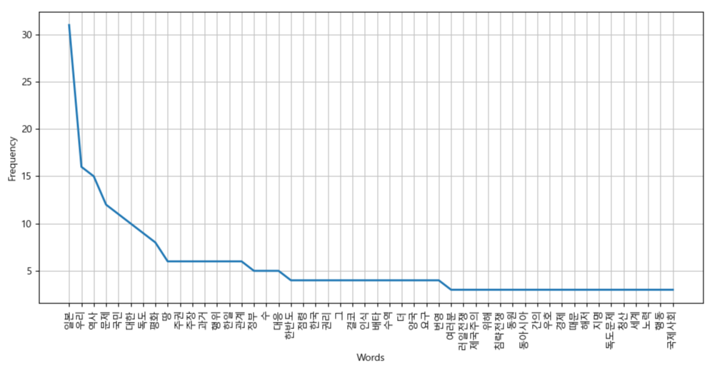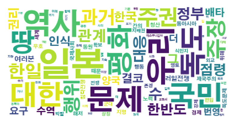 위 그래프는 단어들의 빈도수를 보여줍니다. 당연하겠지만 아무래도 일본, 우리, 역사, 국민, 대한, 독도 얘기가 가장 많이 나온다고 분석되었습니다.