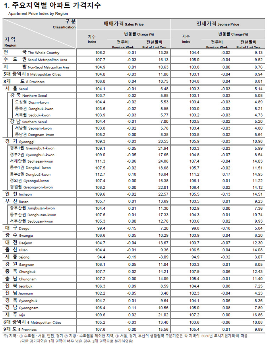 표에서 보시다시피 매매가격은 대구와 세종시를 제외하고 가격지수가 100 이상이고 전세값도 대구와 세종시만 제외하고 모두 100을 넘고 있습니다. 지난주와 비교해서 소폭 오른 곳도 있고 소폭 하락한 곳도 혼재되어 있지만, 대부분 주요 수도권을 중심으로 하락 추세입니다. 작년 12월에 비해서 세종시를 제외한 모든 지역이 상승했습니다. 하지만 지난 주에 비해서는 서울과 수도권은 소폭 하락한 것으로 조사되었습니다. 다음주에 뵙겠습니다.