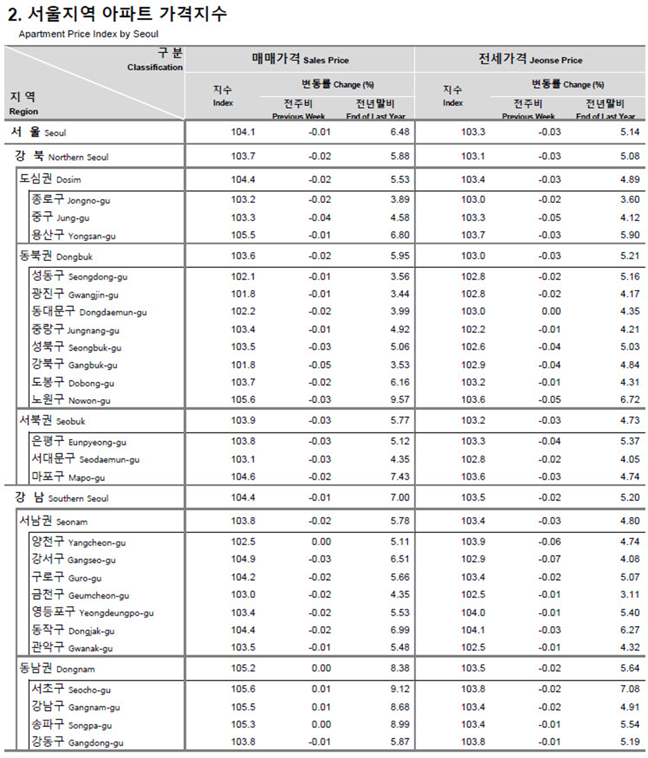 서 울 : 매매 0.01% 하락, 전세 0.03% 하락