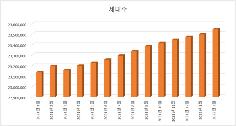 흥미로운 점은 인구는 점점 줄어들고 있는데 세대수가 증가하고 있다는 점입니다. 이것은 1인 가구가 급격하게 증가하고 있다는 의미입니다. 미국과 유럽은 오래전부터 그랬지만, 일본도 마찬가지로 학교를 졸업하면 일단 독립부터 하고 보는데 우리나라도 혼자 살거나 결혼해서 아이 없이 둘이서만 사는 경우가 급격하게 증가하고 있다는 사회적 현상을 확인할 수 있는 통계 자료입니다.