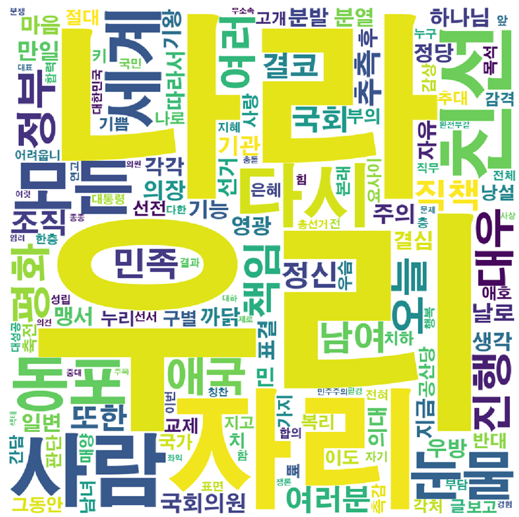 위 그래프는 단어들의 빈도수를 보여줍니다. 우리, 나라, 자리, 사람, 친선, 다시, 모든, 세계, 동포, 눈물 얘기가 가장 많이 나온다고 분석되었습니다. 빈도수 상위 50개만 그래프로 만든 것인데 대한민국과 한국도 없고 우리나라도 없다는 점이 특이합니다. 1위와 2위를 차지한 우리와 나라는 ‘우리나라’와는 관계 없는 단순히 우리와 나라입니다.