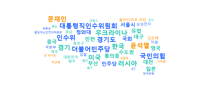참고로 주황색은 인물, 민트색은 장소, 파란색은 기관을 의미합니다. 분석 결과 중 빈도수(키워드가 포함된 뉴스건수)가 높은 순으로 30개만 골라서 어떤 이슈인지, 왜 이런 기사가 나오게 된 것인지에 대해 짧게 정리해봤습니다.