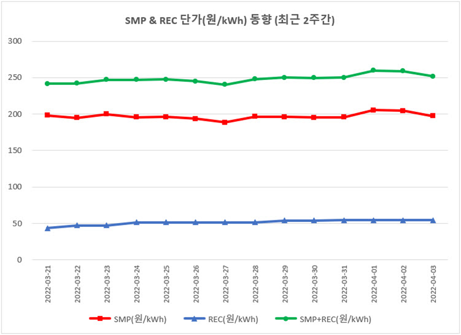 | 날짜 | SMP(원/kWh) | REC(원/kWh) | SMP+REC(원/kWh) |