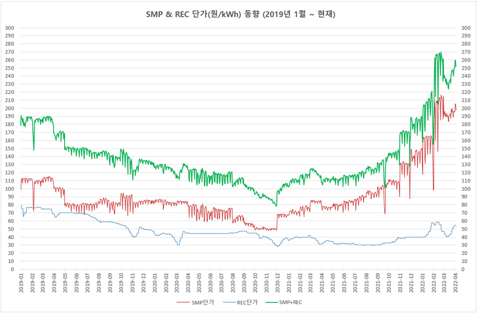 보시다시피 REC는 꾸준히 하락하고 있는데 SMP는 하락하다가 2020년 12월부터 급격히 상승했지만 다시 하락하다가 다시 상승 추세입니다. 유가 변동에 의해 SMP가 영향을 받고 있는 것으로 추정됩니다.