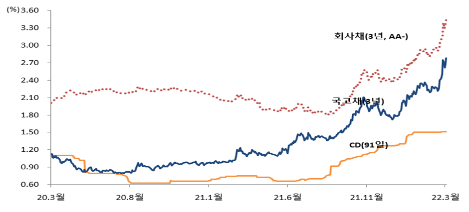 | 회사채(3년,AA-) | 2.21 | 2.42 | 3.16 | 3.46 | 9.3% | 43.1% |