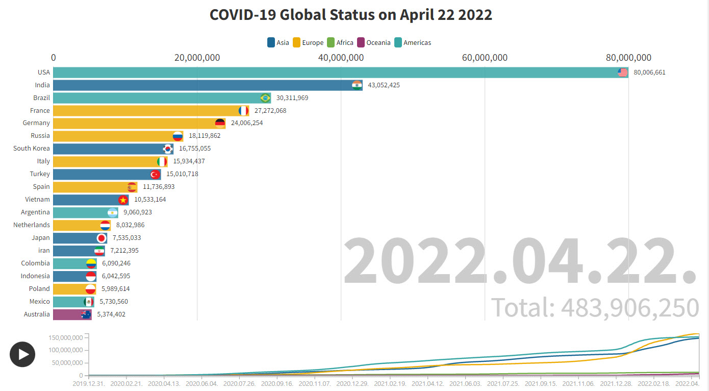 코로나19 전세계 확진자 순위 바 차트 레이스, 2022년 4월 22일 기준 (Global Status of COVID-19 Pandemic by April 22 2022)
