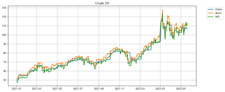 유가 (두바이, 브렌트, 텍사스산 중질유, 2021-01-01 ~ 현재)