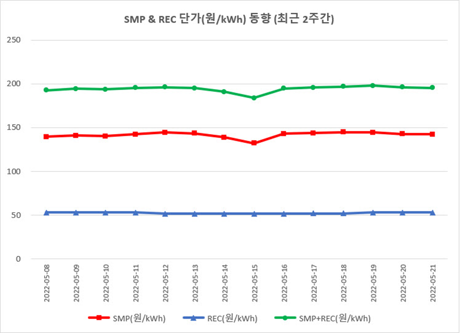 보시는 바와 같이 5월 1일 폭락 이후 지난 2주간 SMP와 REC는 모두 거의 변동 없이 유지되고있습니다. 지난달 말 대비 SMP가 60원/kWh 가량 폭락했습니다. SMP의 상승 추세가 다소 꺾인 모습이고 시장은 좀 더 지켜봐야 할 것 같습니다. SMP가 200원대 이상 고공행진을 지속하다가 5월이 시작되자 마자 갑자기 폭락하여 당황스럽습니다. 어쨌든 아직도 작년에 비해 높은 편이긴 하지만 갑자기 폭락하여 당황스럽습니다. 언론에 보도된 SMP 폭락의 이유는 SMP 단가 결정에 결정적으로 영향을 미치는 LNG 가격이 난방 수요의 급감으로 급락하여 낮아진 것이라고 합니다. 발전 사업을 추진하시거나 진행 중이신 분들께서는 시장 상황을 예의 주시하셔야 할 것 같습니다.