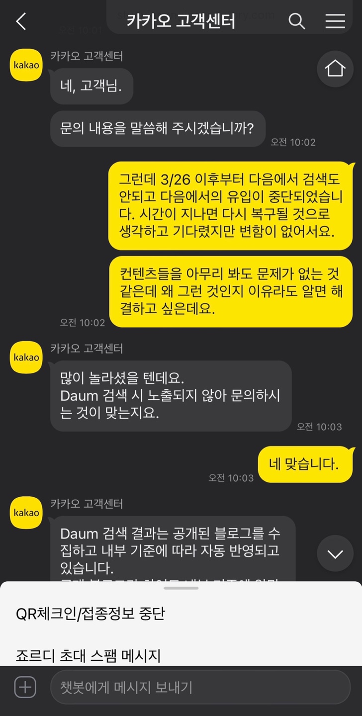 단순히 고객센터에 문의하는 것이 전부였습니다. 물론 어느 블로거께서는 하루아침에 급감한 방문자수는 저품질 블로그로 의심하게끔 만든 컨텐츠가 문제일 거라고 생각하셔서 거의 한달치 컨텐츠를 지우시고 고객센터에 문의하셨다고 합니다.