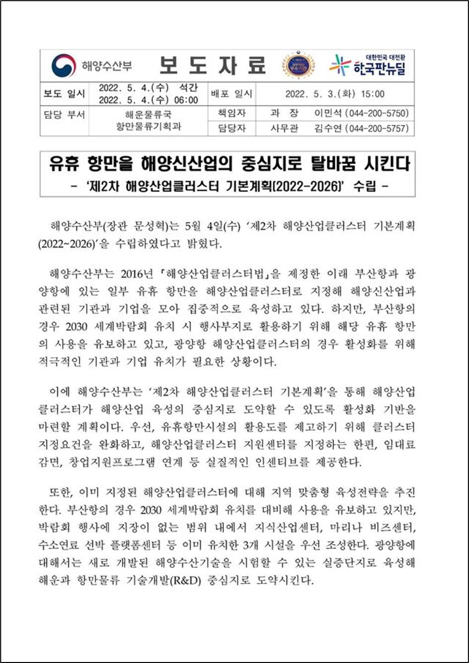 해양수산부(장관 문성혁)는 5월 4일(수) ‘제2차 해양산업클러스터 기본계획(2022~2026)’을 수립하였다고 밝혔다.