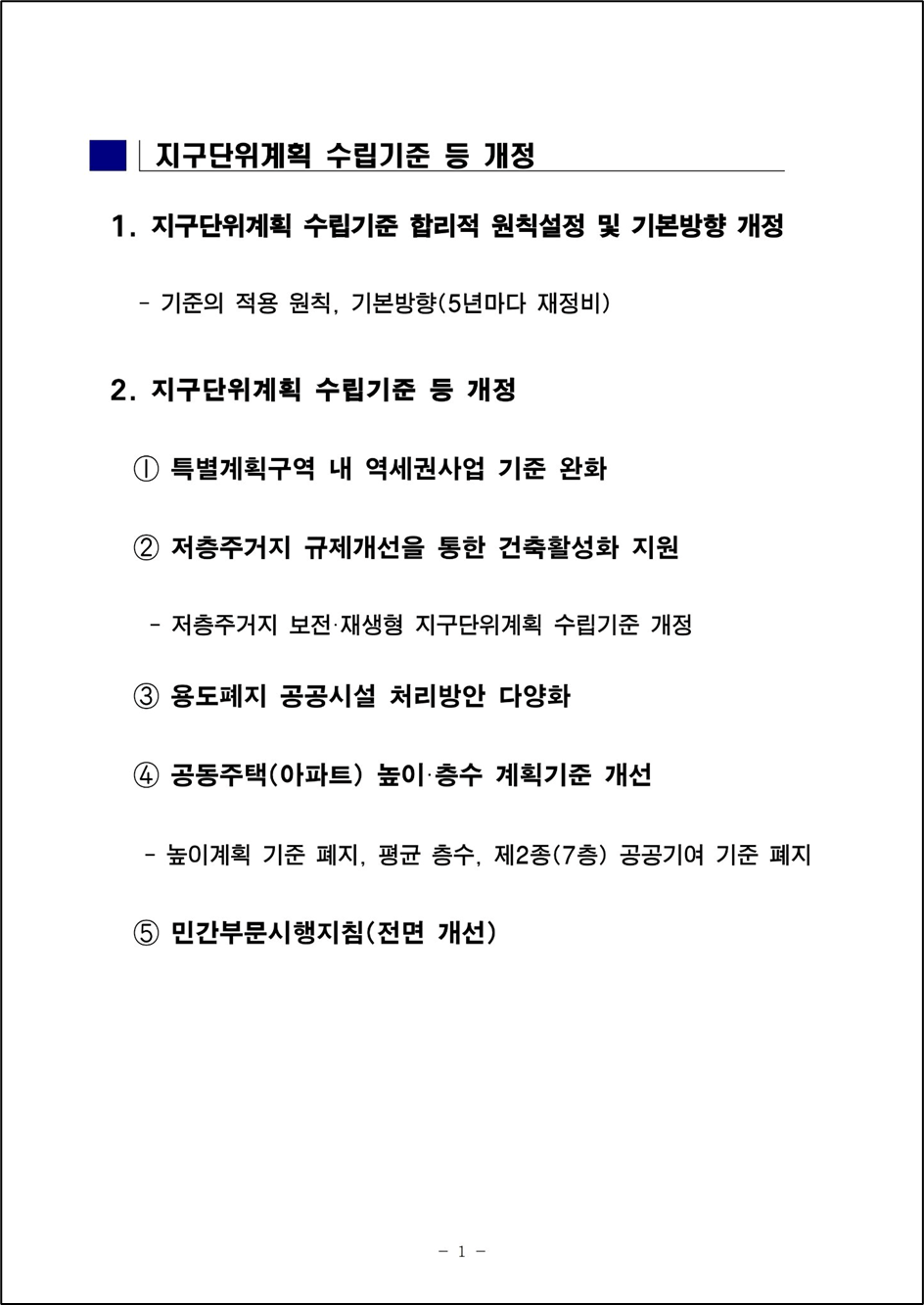1. 지구단위계획 수립기준 합리적 원칙설정 및 기본방향 개정- 기준의 적용 원칙, 기본방향(5년마다 재정비)