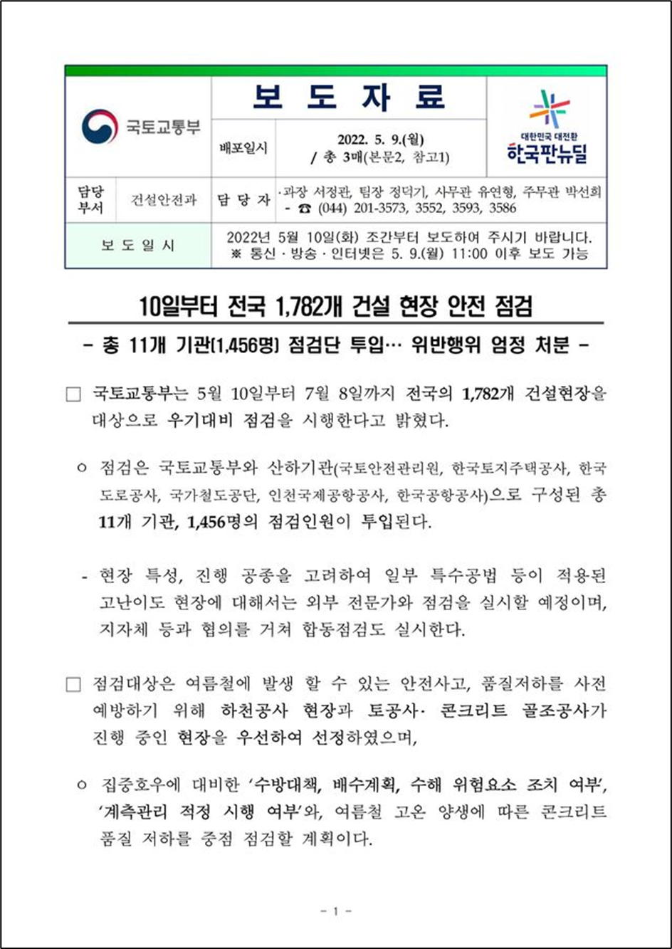 국토교통부는 5월 10일부터 7월 8일까지 전국의 1,782개 건설현장을 대상으로 우기대비 점검을 시행한다고 밝혔다. 점검은 국토교통부와 산하기관(국토안전관리원, 한국토지주택공사,