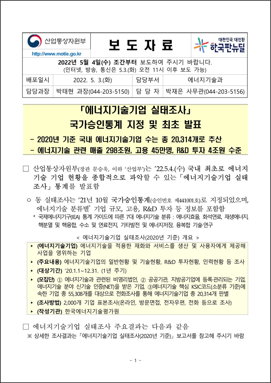 내용 「에너지기술기업 실태조사」 국가승인통계 지정 및 최초 발표 - 2020년 기준 국내 에너지기술기업 수는 총 20,314개로 추산 - 에너지기술 관련 매출 298조원, 고용 45만명, R&D 투자 4조원 수준