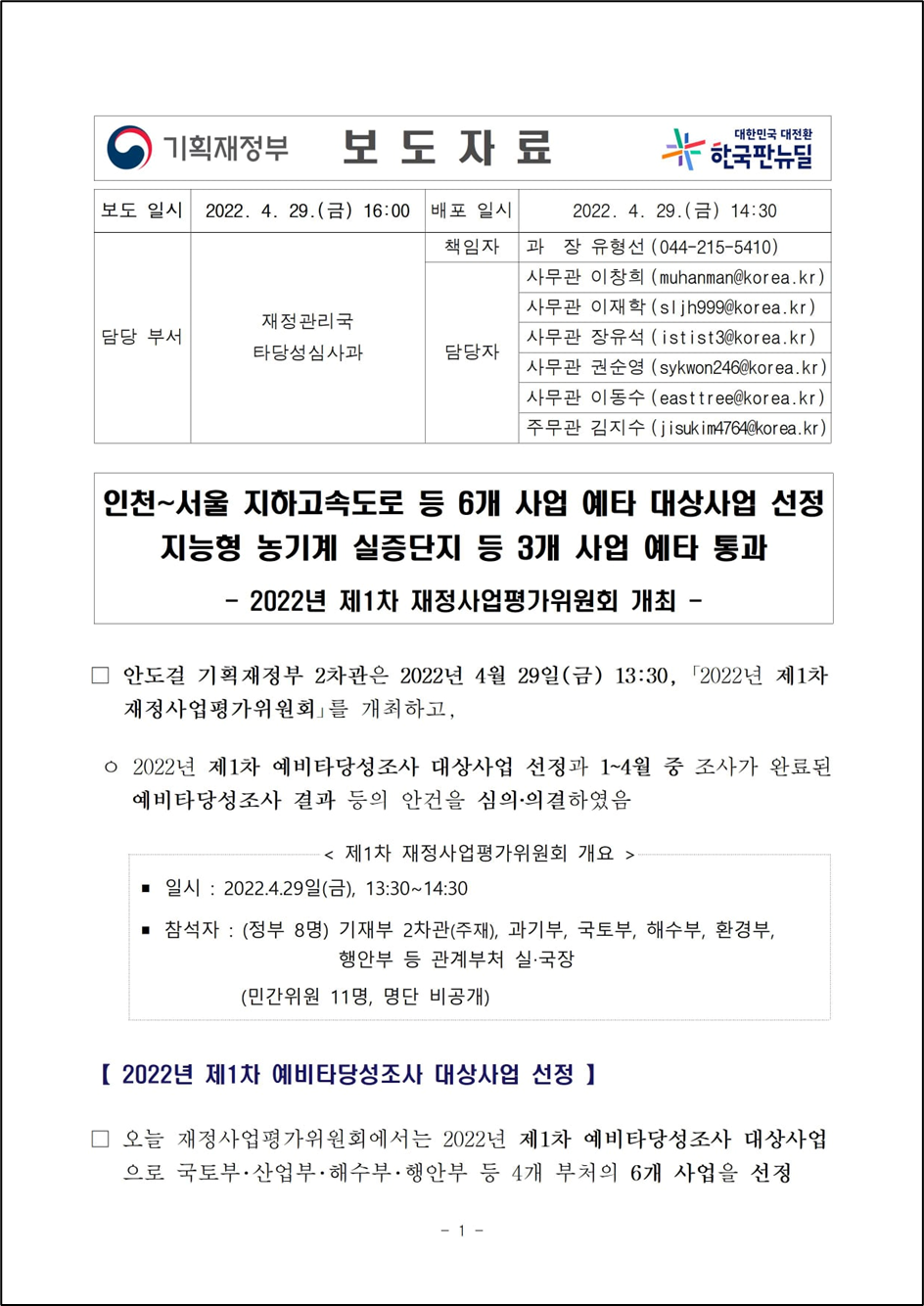 기획재정부는 ’22년 제1차재정사업평가위원회를 4.29(금) 개최하였다. - ’22년 제1차 예비타당성조사 대상사업 선정과 1~4월 중 조사가 완료된 예비타당성조사 결과 등의 안건을 심의?의결하였