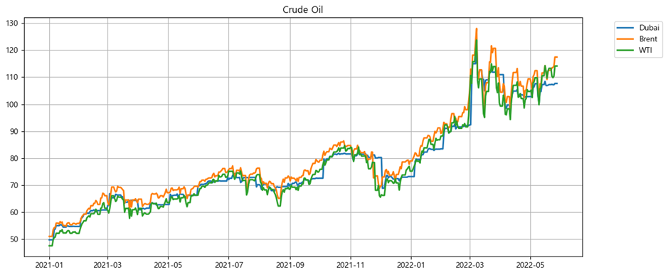 유가 (두바이, 브렌트, 텍사스산 중질유, 2021-01-01 ~ 현재)
