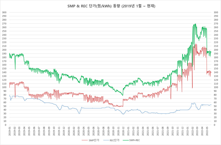 보시다시피 REC는 꾸준히 하락하고 있는데 SMP 급상승 중이다가 2022년 5월 1일 폭락이 있었습니다. 보통 SMP는 유가 변동에 의해 영향을 받는 것으로 알려져 있는데 현재의 폭락은 유가와는 관련이 없는 것 같습니다. 좀 더 지켜봐야 알 것 같습니다.