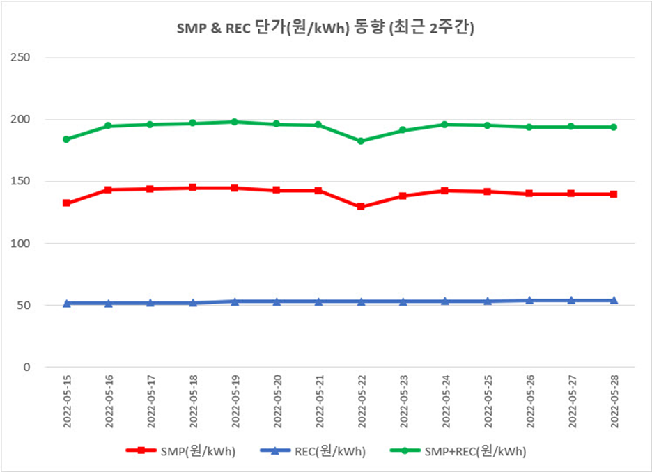 보시는 바와 같이 5월 1일 폭락 이후 지난 3주간 SMP와 REC는 모두 거의 변동 없이 유지되고있습니다. 지난달 말 대비 SMP가 60원/kWh 가량 폭락했습니다. SMP의 상승 추세가 다소 꺾인 모습이고 시장은 좀 더 지켜봐야 할 것 같습니다. SMP가 200원대 이상 고공행진을 지속하다가 5월이 시작되자 마자 갑자기 폭락하여 당황스럽습니다.