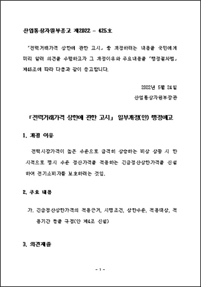 내용 산업통상자원부공고 제2022 - 425호「전력거래가격 상한에 관한 고시」 중 개정하려는 내용을 국민에게 미리 알려 의견을 수렴하고자 그 개정이유와 주요내용을 「행정절차법」 제46조에 따