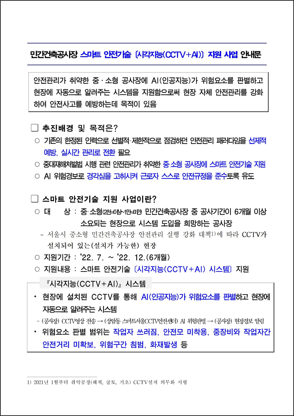 안전관리가 취약한 중․소형 공사장에 AI(인공지능)가 위험요소를 판별하고 현장에 자동으로 알려주는 시스템을 지원함으로써 현장 자체 안전관리를 강화하여 안전사고를 예방하는데 목적이 있음
