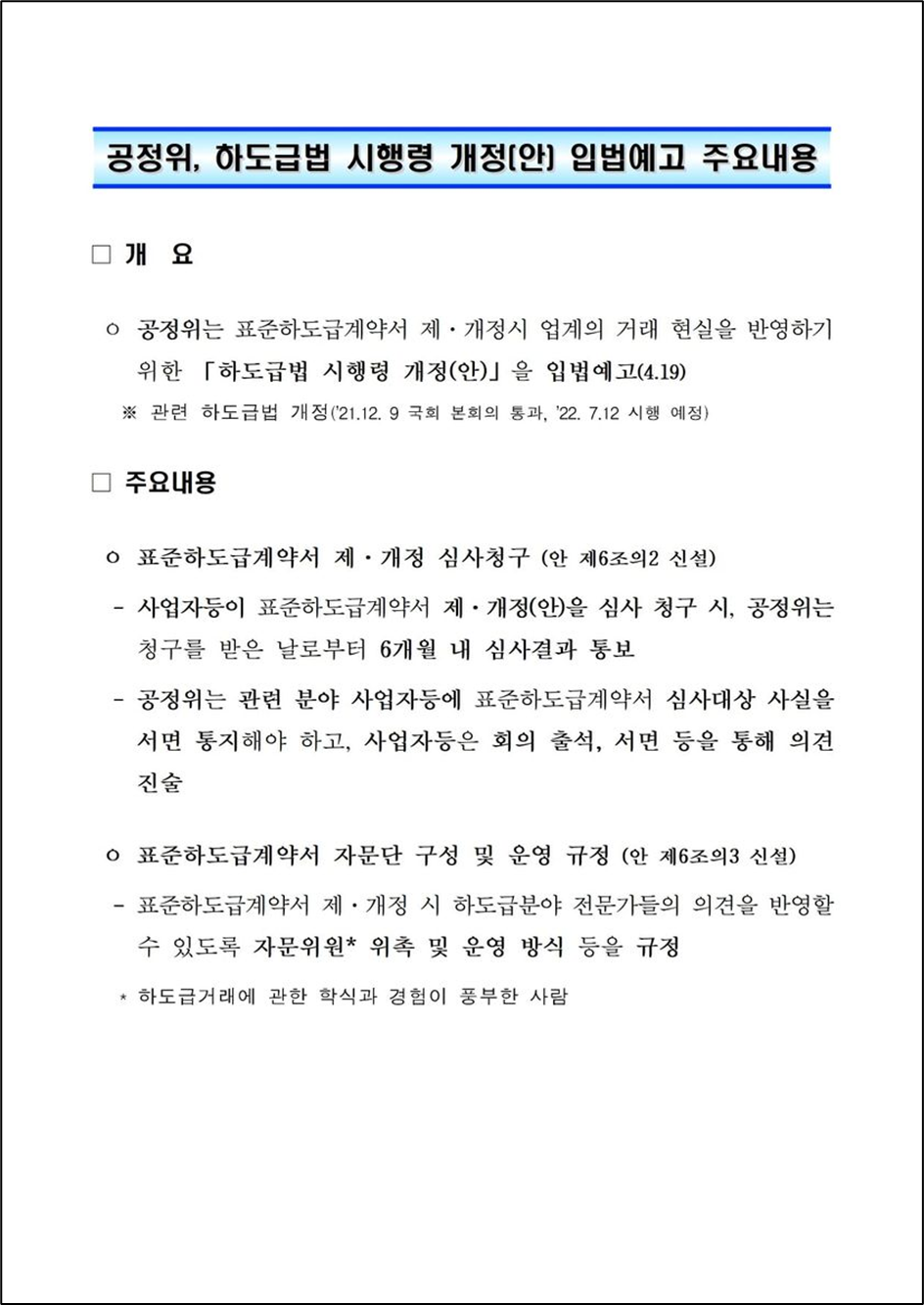 ㅇ 공정위는 표준하도급계약서 제·개정시 업계의 거래 현실을 반영하기 위한 「하도급법 시행령 개정(안)」을 입법예고(4.19)