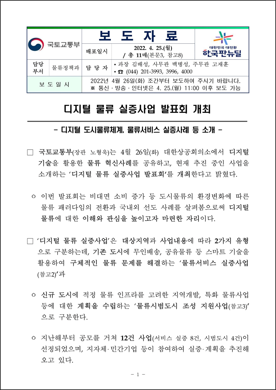 국토교통부(장관 노형욱)는 4월 26일(화) 대한상공회의소에서 디지털 기술을 활용한 물류 혁신사례를 공유하고, 현재 추진 중인 사업을 소개하는 ‘디지털 물류 실증사업 발표회‘를 개최한다고 밝혔다.