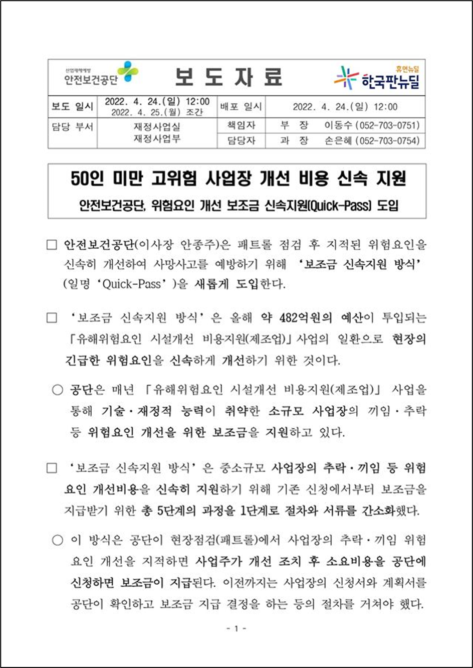 안전보건공단(이사장 안종주)은 패트롤 점검 후 지적된 위험요인을 신속히 개선하여 사망사고를 예방하기 위해 ‘보조금 신속지원 방식’(일명‘Quick-Pass’)을 새롭게 도입한다.