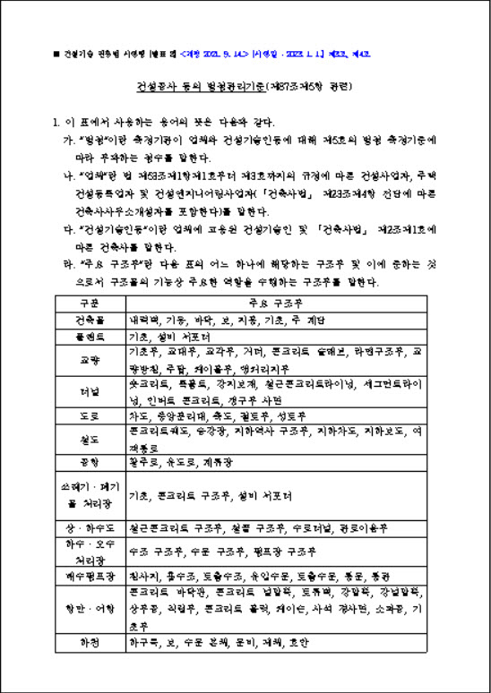 라. "주요 구조부"란 다음 표의 어느 하나에 해당하는 구조부 및 이에 준하는 것으로서 구조물의 기능상 주요한 역할을 수행하는 구조부를 말한다.