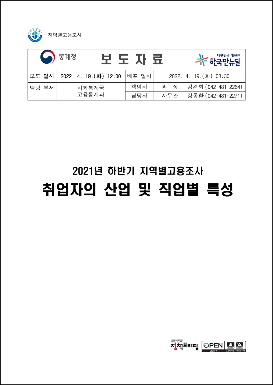 통계청은 ’21년 하반기 지역별고용조사 취업자의 산업 및 직업별 특성을 4.19(화) 발표하였다.