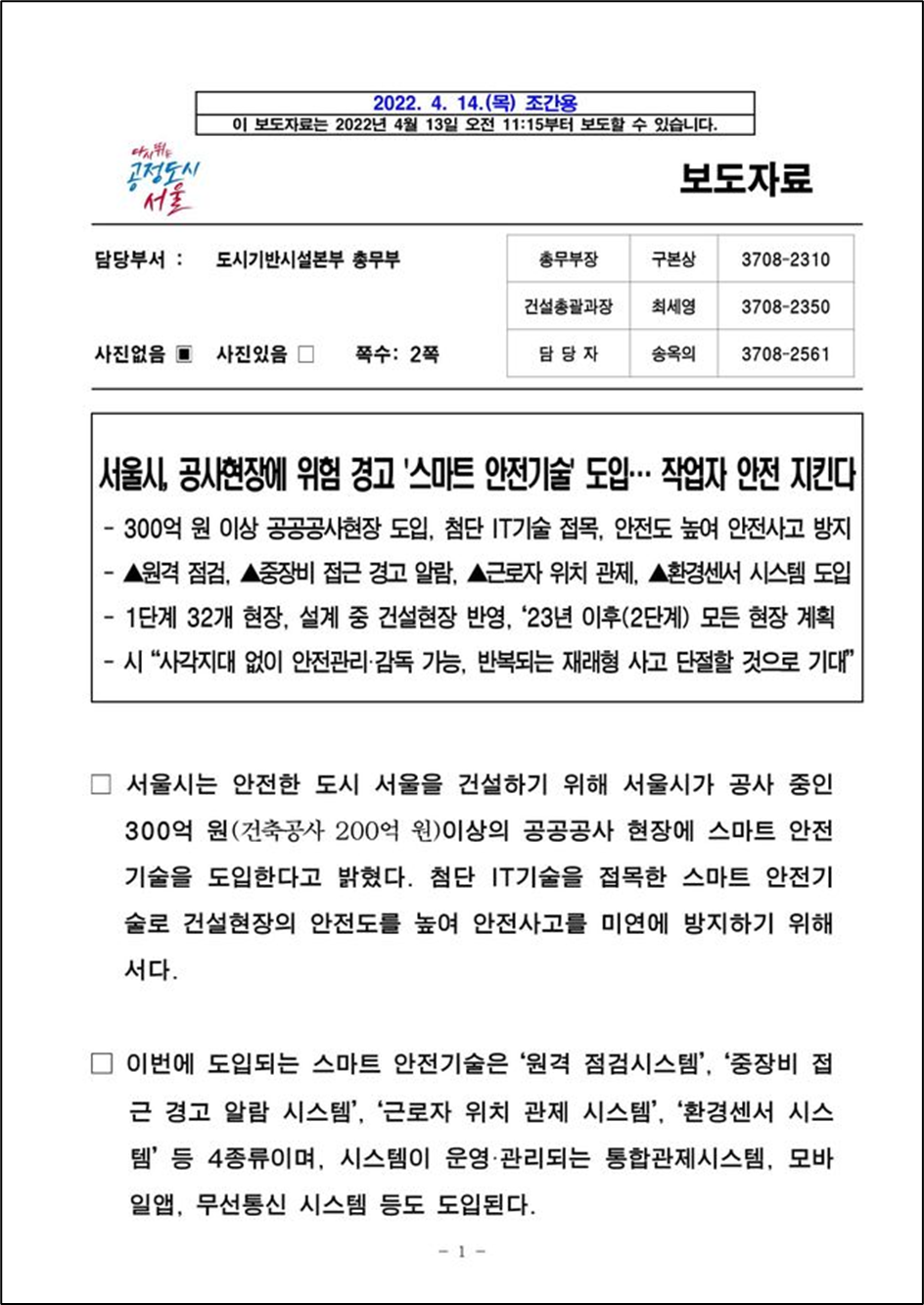 - 300억 원 이상 공공공사현장 도입, 첨단 IT기술 접목, 안전도 높여 안전사고 방지