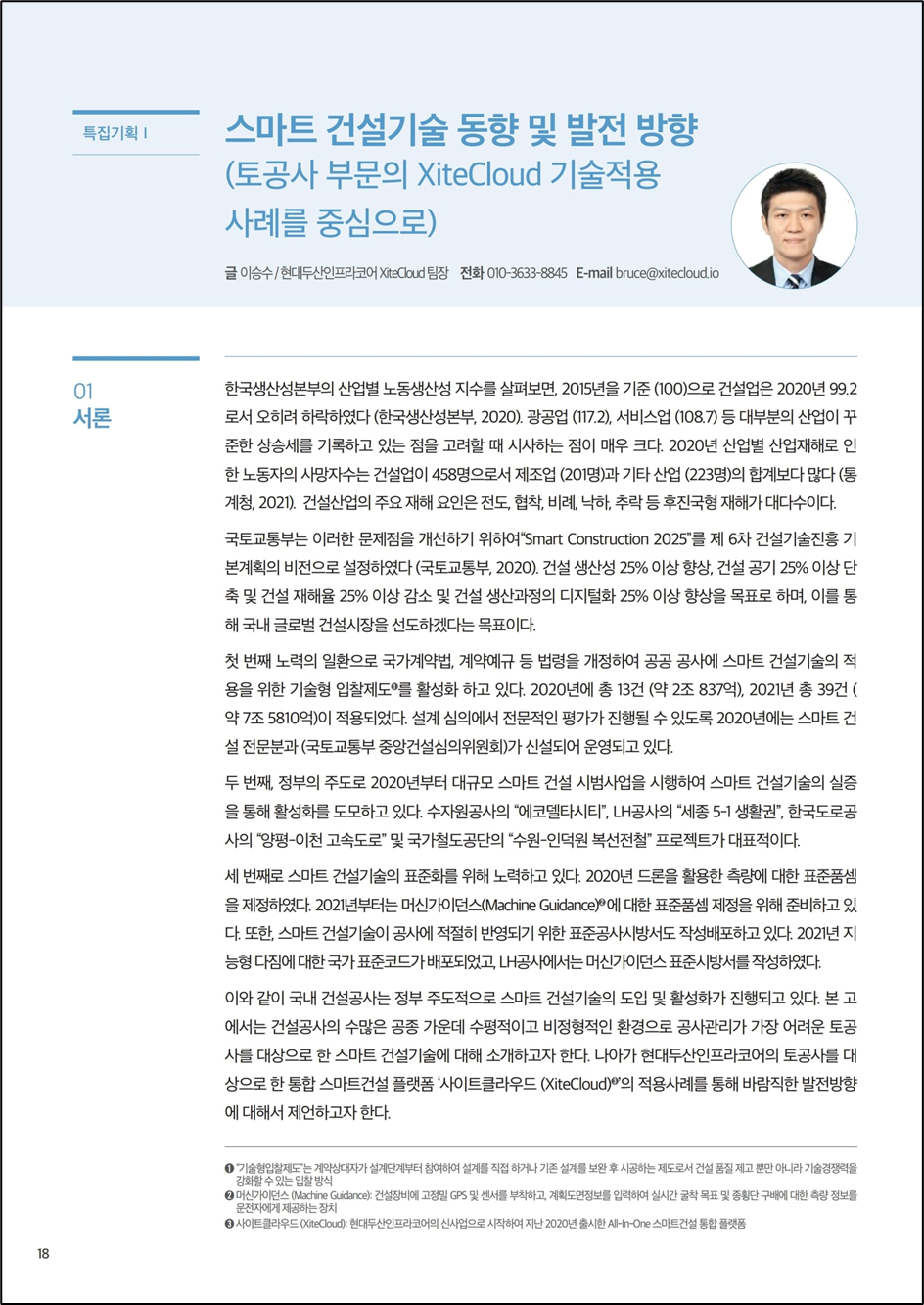 이와 같이 국내 건설공사는 정부 주도적으로 스마트 건설기술의 도입 및 활성화가 진행되고 있다. 본 고에서는 건설공사의 수많은 공종 가운데 수평적이고 비정형적인 환경으로 공사관리가 가장 어려운 토공사를 대상으로 한 스마트 건설기술에 대해 소개하고자 한다. 나아가 현대두산인프라코어의 토공사를 대상으로 한 통합 스마트건설 플랫폼 ‘사이트클라우드 (XiteCloud)’의 적용사례를 통해 바람직한 발전방향에 대해서 제언하고자 한다.
