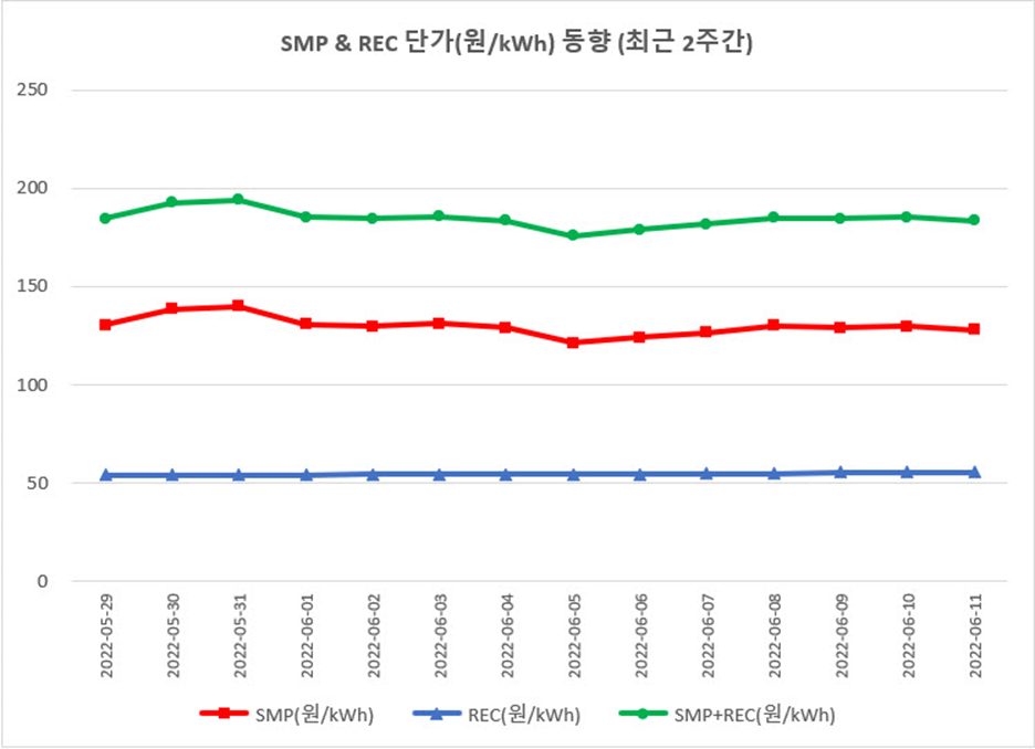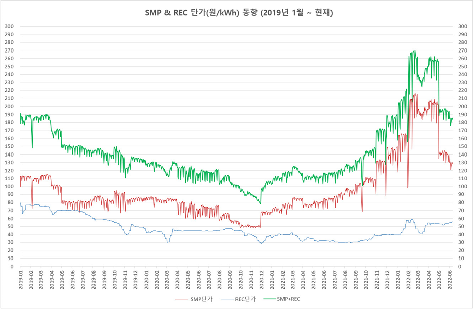 | 날짜 | SMP(원/kWh) | REC(원/kWh) | SMP+REC(원/kWh) |