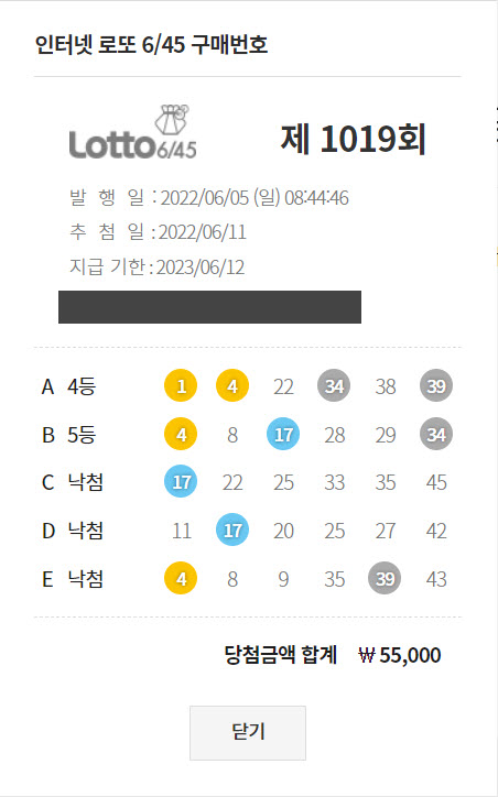 어제 1019회 로또 추첨이 있었습니다. 매주 동행복권 사이트에서 5천원씩 사고 있었는데 하도 당첨 소식이 없어서 이번에도 꽝이겠지 하고 잊고 있다가 일요일 아침에 확인해보니 4등 하나, 5등 하나 당첨됐습니다.
