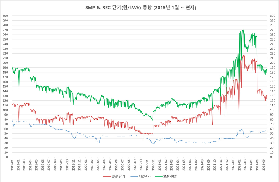 보시다시피 REC는 꾸준히 하락하고 있는데 SMP 급상승 중이다가 2022년 5월 1일 폭락이 있었습니다. 보통 SMP는 유가 변동에 의해 영향을 받는 것으로 알려져 있는데 현재의 폭락은 유가와는 관련이 없는 것 같습니다. 좀 더 지켜봐야 알 것 같습니다.