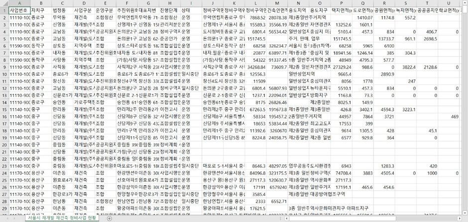 서울시 내에서 진행중인 재개발/재건축/도시환경정비사업 정보를 조회하는 서비스입니다. 2021년 5월 현재 서울시 내에 진행 중인 재개발 사업 관련 현황입니다. 지금은 업데이트가 되었을 테지만 서울시에서 공공데이터로 제공한 가장 최신 정보이니 참고만 하시기 바랍니다.