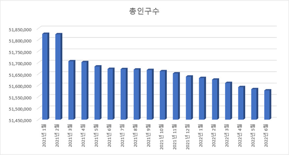테이블은 시각적으로 한 눈에 통계를 파악하기가 쉽지는 않습니다. 하지만 자세히 보면, 우리나라 인구가 줄어들고 있다는 것을 알 수 있습니다. 우리나라 인구는 2021년 1월에 비해 2022년 6월은 약 25만명 가량 줄어들었습니다. 그리고 남자보다 여자 인구가 15만명 가량 많다는 것을 알 수 있습니다.